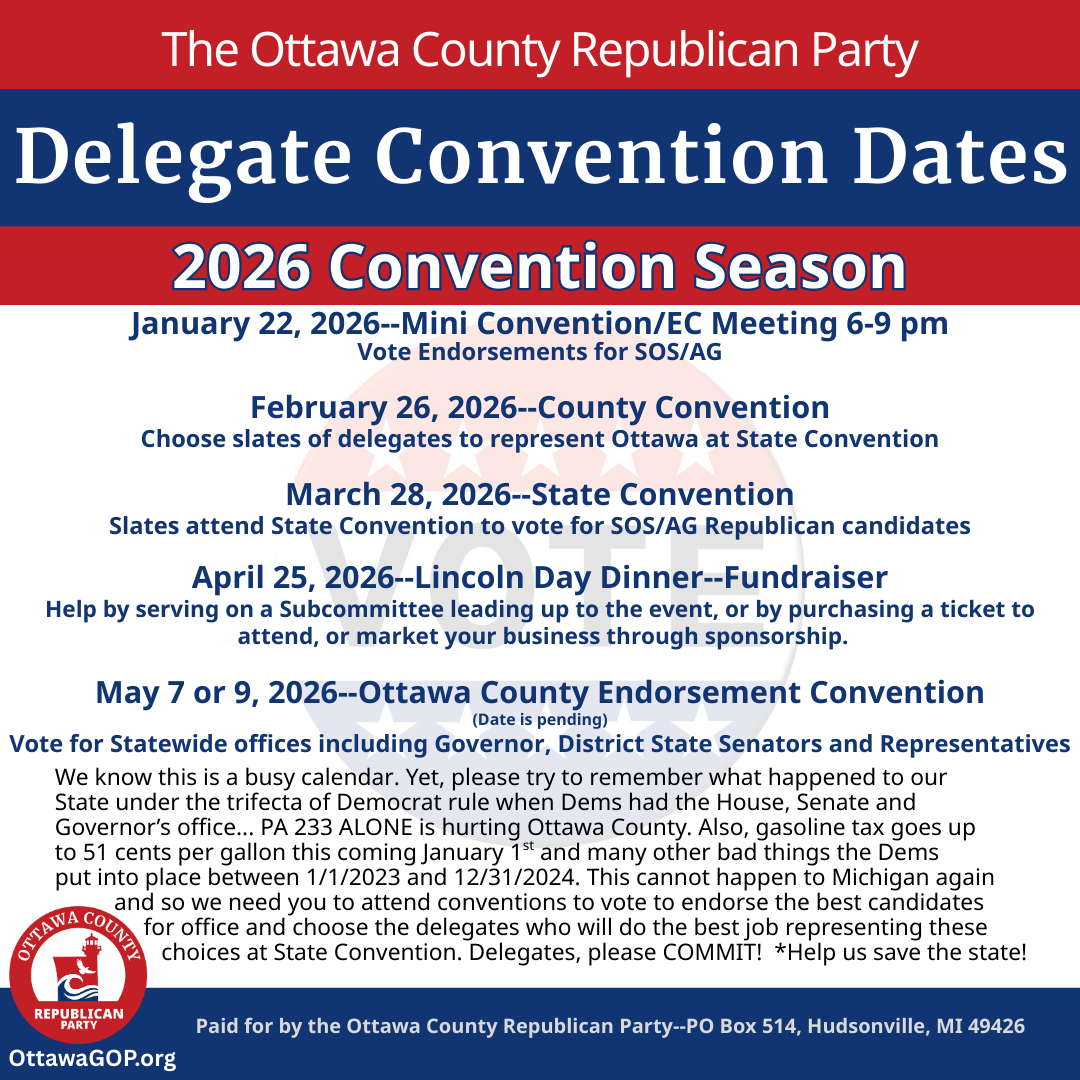 Please help us preserve liberty in Ottawa County by making a donation of any size here. Thank you! *The Ottawa County Republican Party is committed to Preserving Liberty in Ottawa County and Keeping Ottawa Red by running constitutional conservatives for public office. It is our commitment to you as citizens for you to have the best representation you can possibly have.