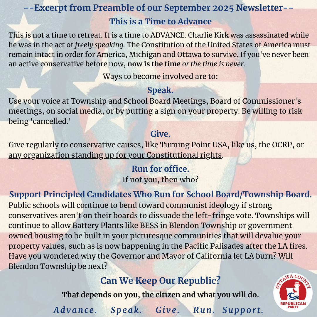 This is not a time to retreat. It is a time to ADVANCE. Charlie Kirk was assassinated while he was in the act of freely speaking. The Constitution of the United States of America must remain intact in order for America, Michigan and Ottawa to survive. If you've never been an active conservative before now, now is the time or the time is never.